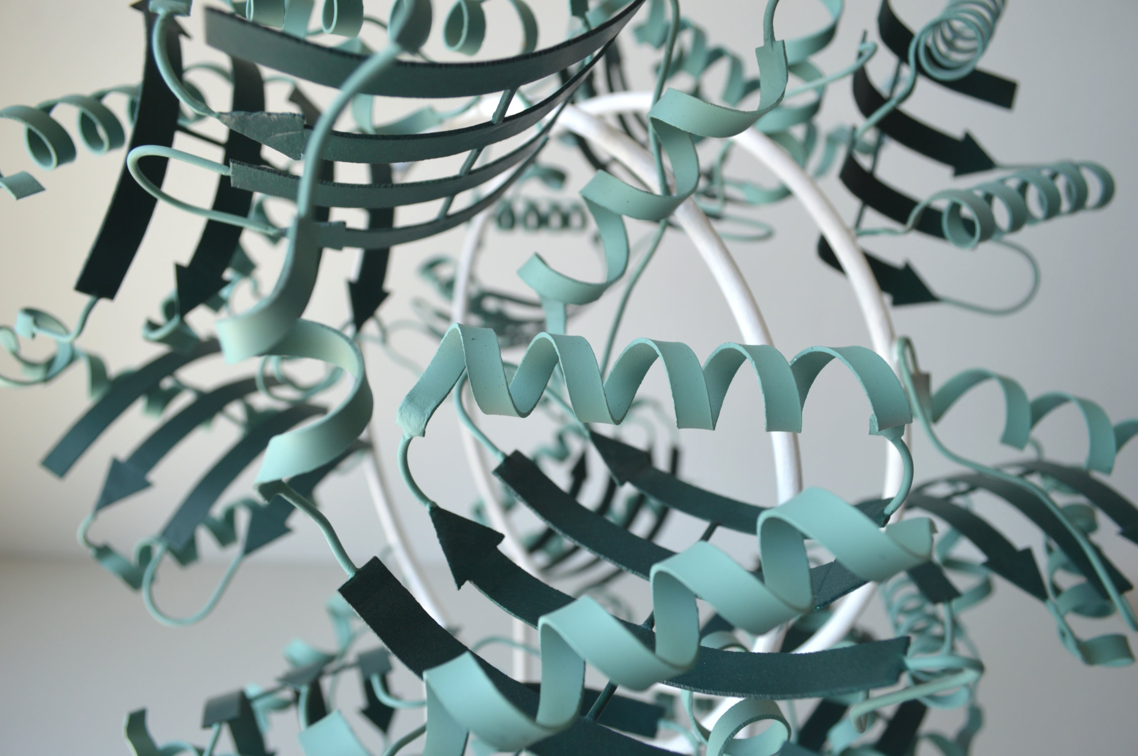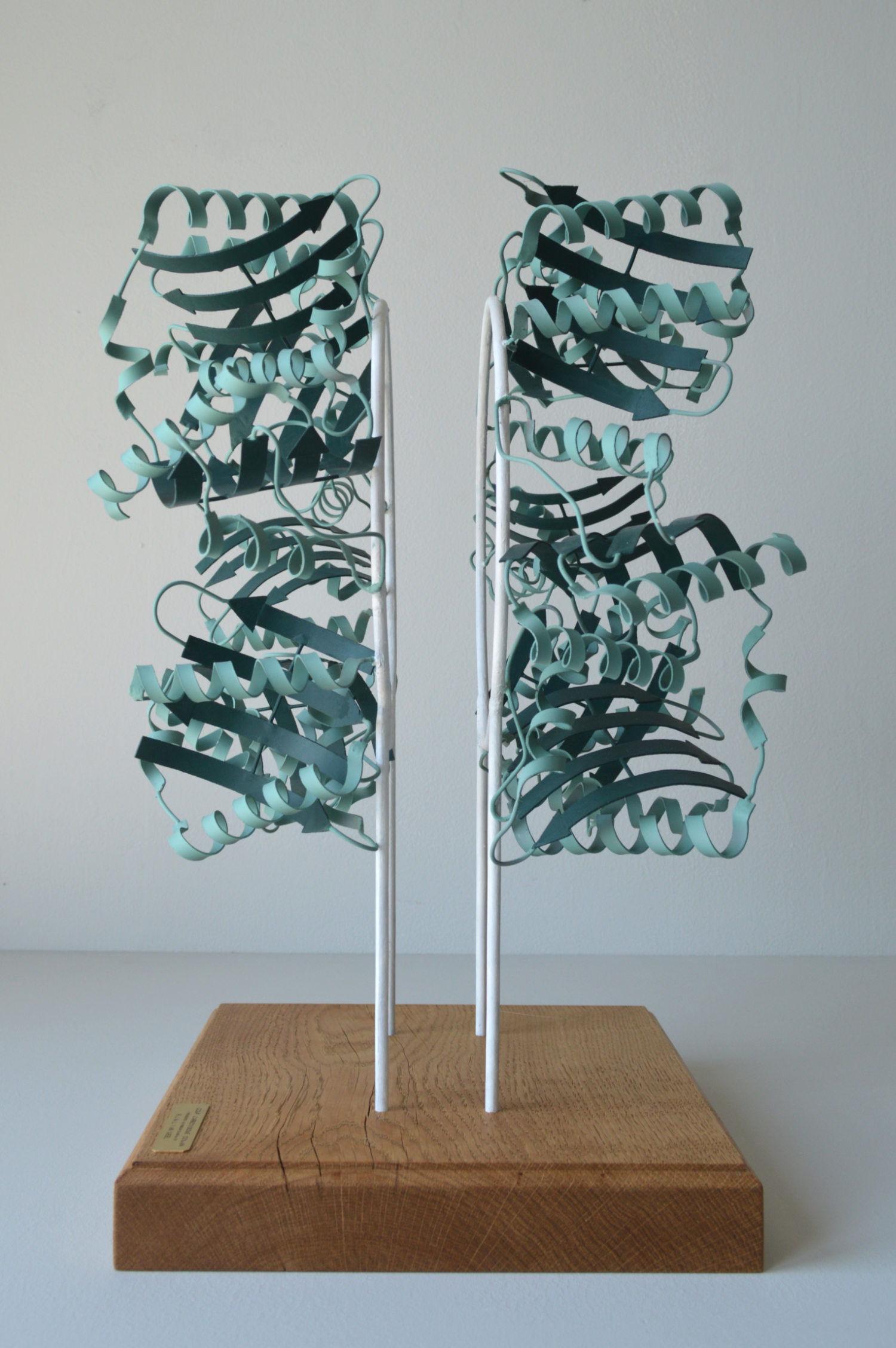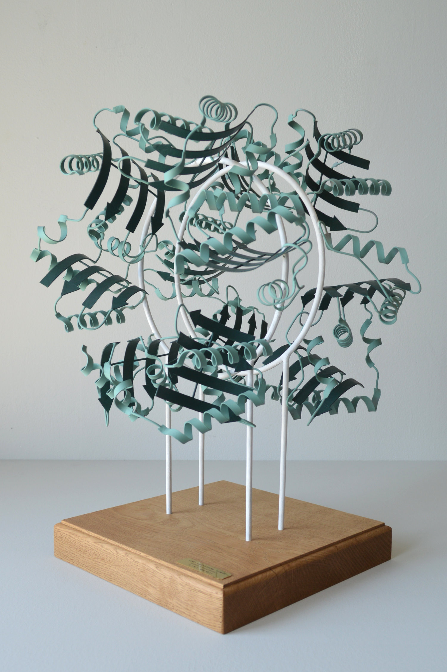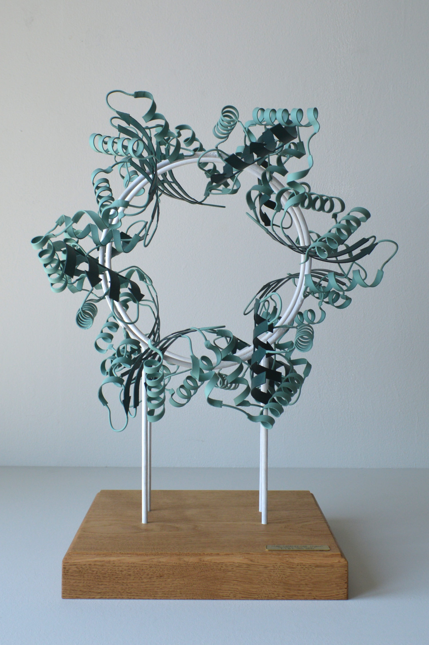 CcmP Carboxysome Domain | 2023 | brass, acrylic | 31 x 34 x 48 cm ![]() ![]() ![]() ![]() CO2 fixation is promoted by encapsulating and co-localizing the CO2-fixing enzymes within a protein shell, the carboxysome. A key feature of the carboxysome is its ability to control selectively the flux of metabolites in and out of the shell. The β-carboxysome shell protein CcmP has been shown to form a double layer of pseudohexamers with a relatively large central pore, which may allow passage of larger metabolites such as the substrate for CO2 fixation through the shell. |
